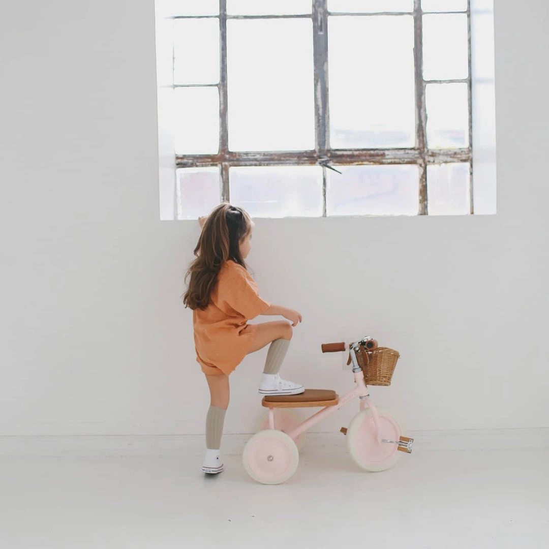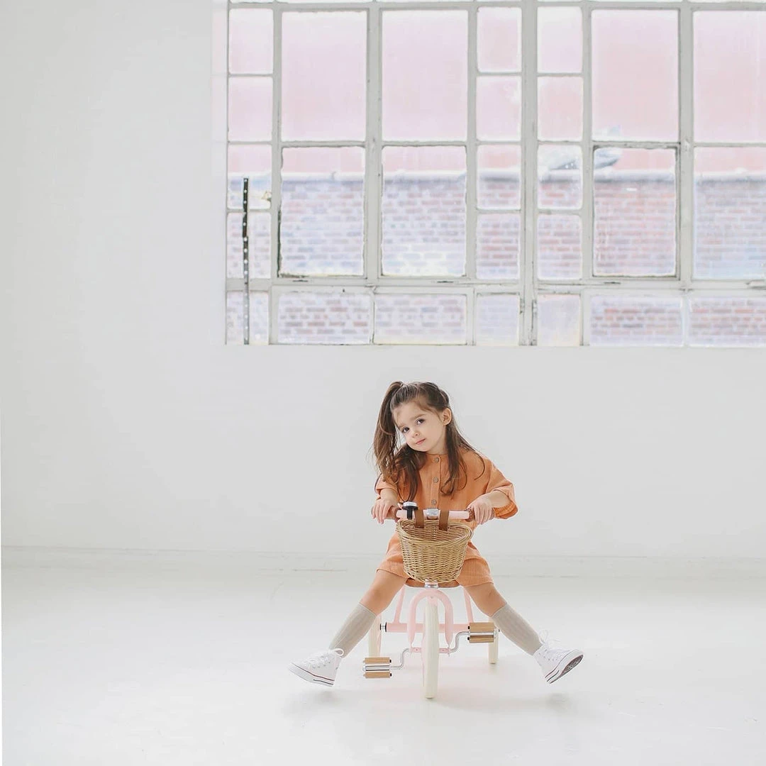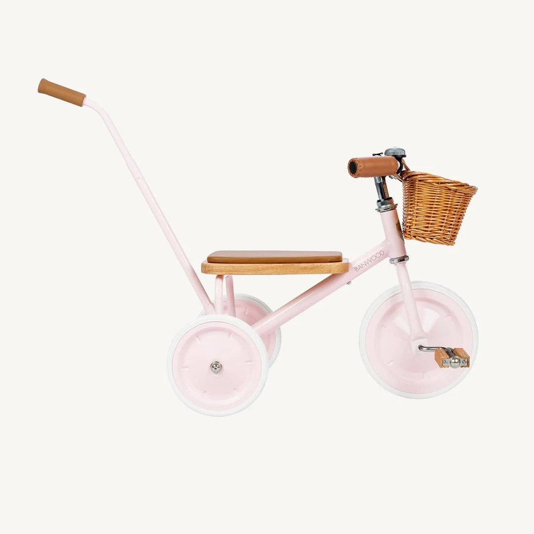 Banwood Trike With this classic designed pink toddler tricycle, you can bring everyone in the family for an outdoor bike ride, even the youngest one! This blue vintage tricycle in is suitable for children from 2 years and is the perfect way to practice their balance and motor skills. It comes with a softly padded oak seat, durable rubber wheels, vegan leather details, wooden oak pedals, a removable push bar in the back and a wicker basket in front.