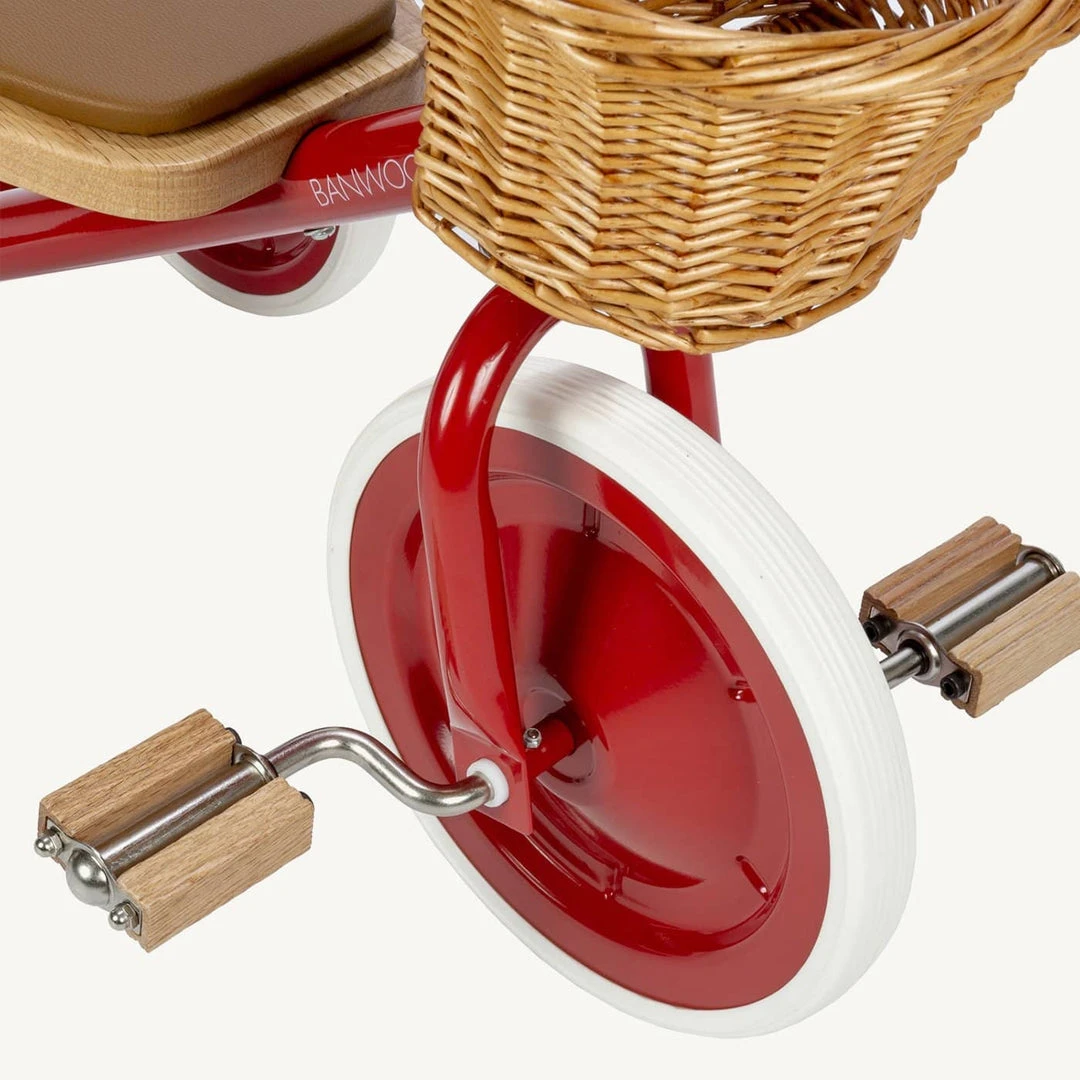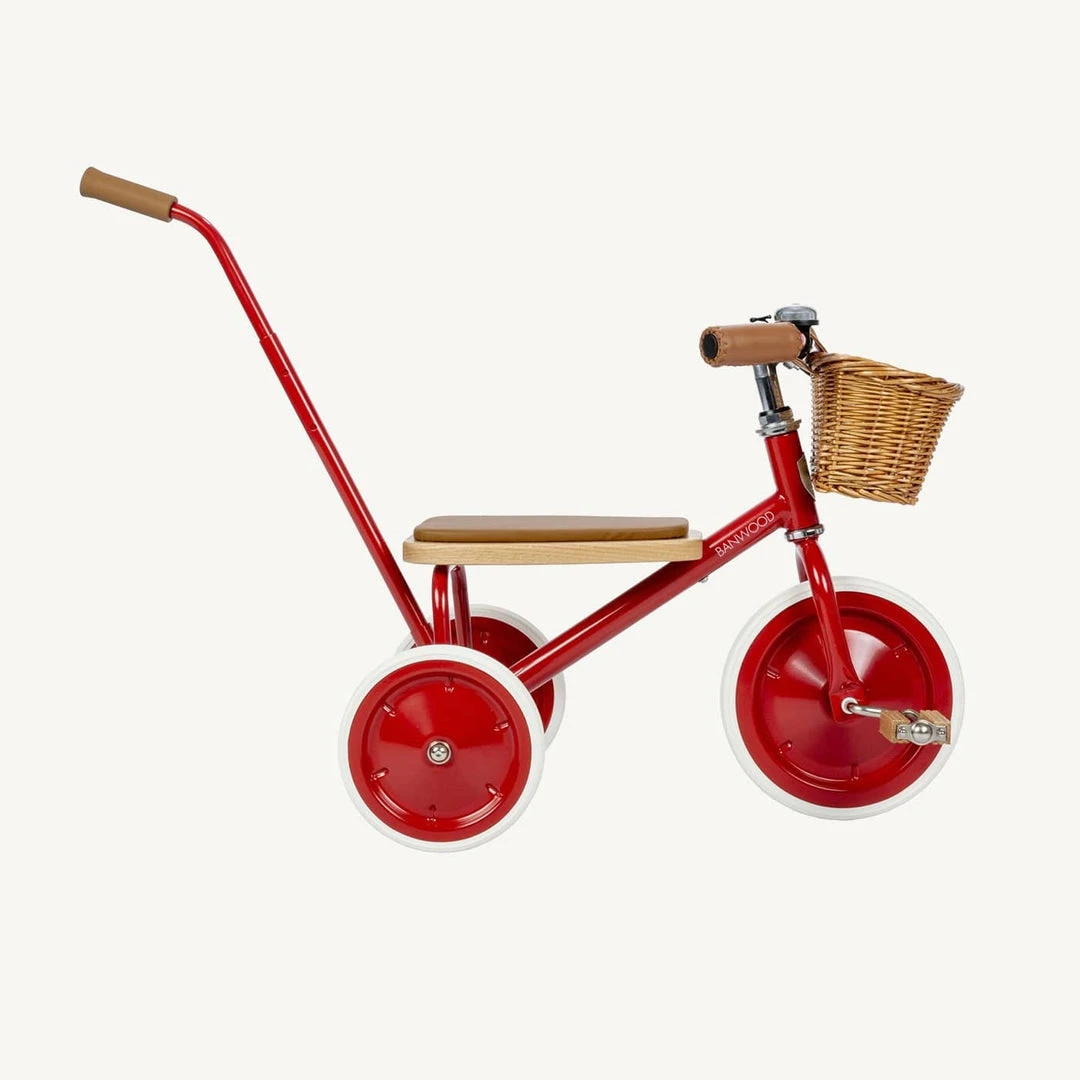 Banwood Trike With this classic designed red toddler tricycle, you can bring everyone in the family for an outdoor bike ride, even the youngest one! This blue vintage tricycle in is suitable for children from 2 years and is the perfect way to practice their balance and motor skills. It comes with a softly padded oak seat, durable rubber wheels, vegan leather details, wooden oak pedals, a removable push bar in the back and a wicker basket in front.