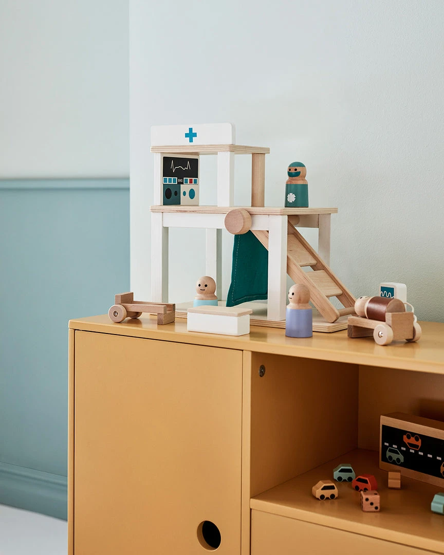 AIDEN Hospital Play Set by Kid’s Concept. Welcome to the ultimate health care facility in Aiden City. At the hospital, you never know which patients you will see. Fortunately, the chief surgeon Tora and the specialist nurse Cam are always ready. On the first floor, there is a curtain that can serve as a room divider. You can either use this area as a reception and examination room or use the entire floor as a garage for Aiden City’s ambulance. To get up to the second floor, there is a belly-tickling stretcher lift with a turning handle that makes everything go smoothly. There are, of course, state-of-the-art instruments that, among other things, can see if your heart sounds okay. Talk about pros. Suitable for ages 3 years+