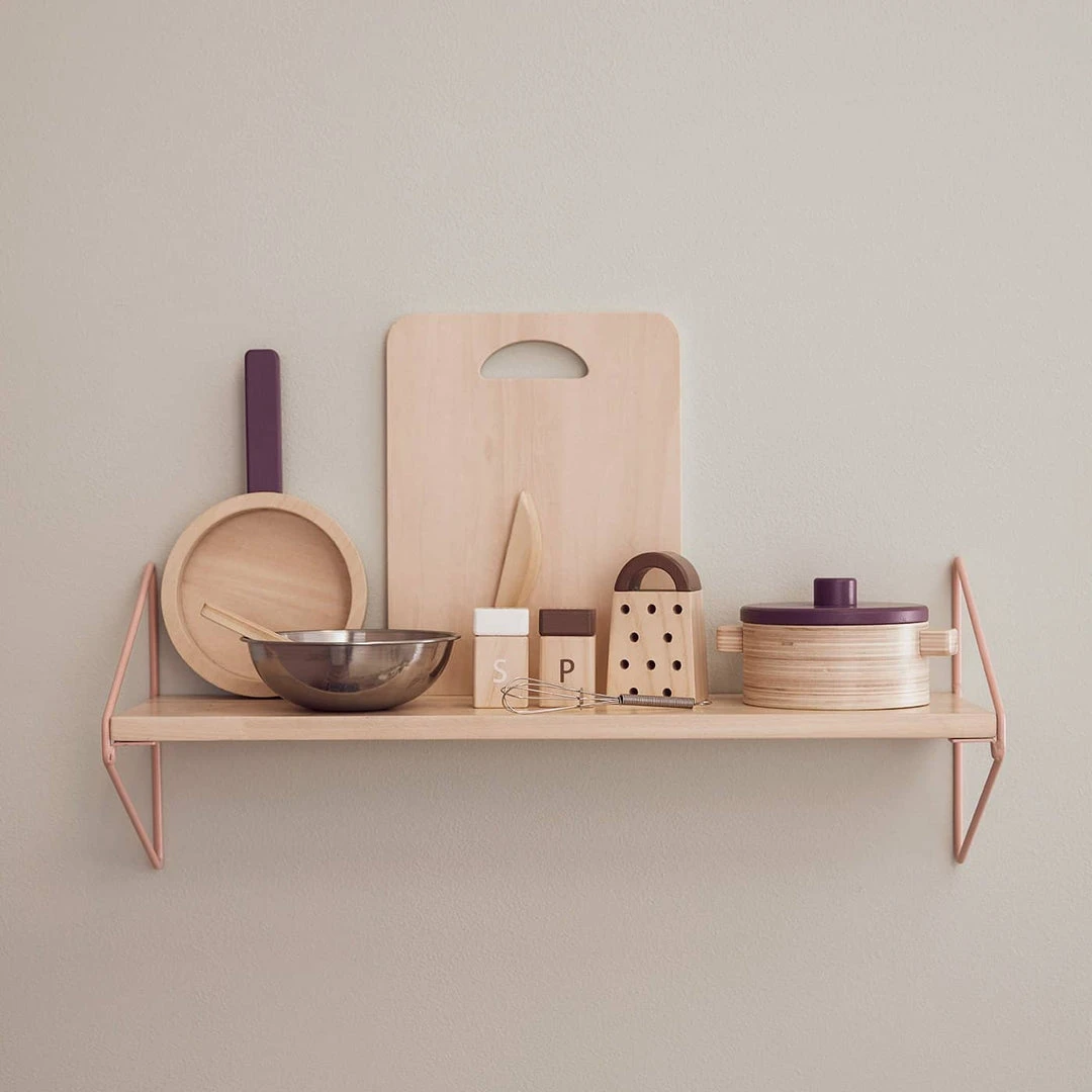 Bistro Cookware Play Set by Kid’s Concept. The ultimate wooden play chef set for cooking on our Kid’s Concept stoves and kitchens. The set contains a pot, pan, a metal bowl with whisker, a grater, pepper and salt containers, cutting board and knife. The whole set makes a great addition to any wooden play kitchen. Encourages to hours of play time fun and endless play possibilities. The dinner ware set is a great way to encourage imaginative and creative role play sessions. The knife and cutting board is without lacquer and can be treated with food safe oil.