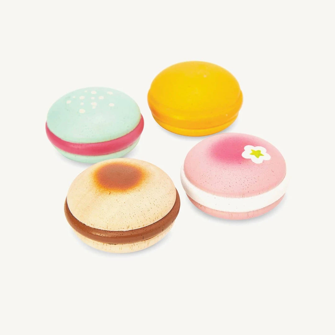 Honeybake Macarons by Le Toy Van. A lovely set of 4 solid wood macarons, each beautifully decorated in different colour ways using soft water based paints and presented in a sweet window gift box. These delicious treats look good enough to eat and are the ideal accessory for our Le Toy Van Honeybake Tea & Treats Trolley and other play sets from the Honeybake collection.