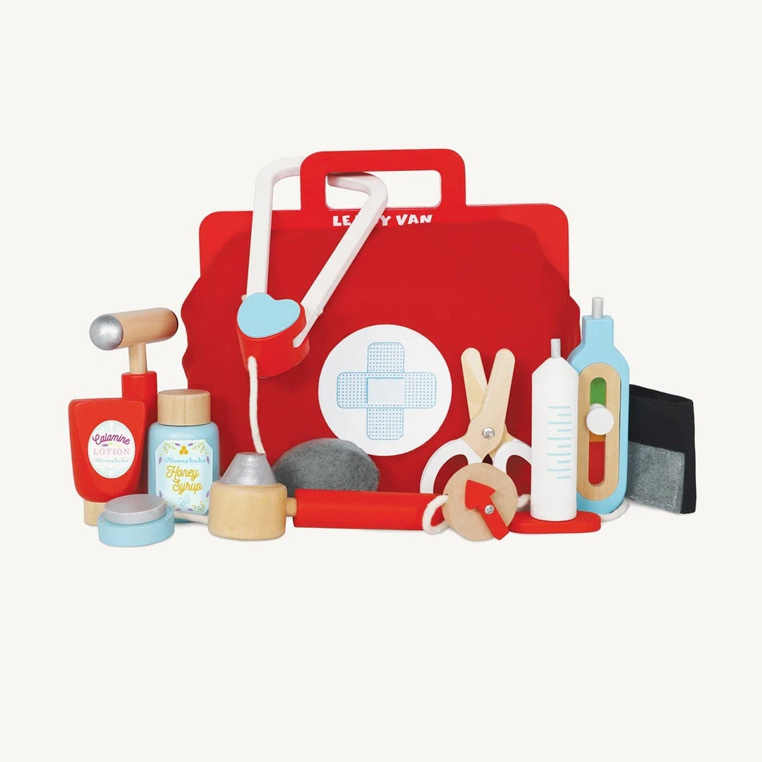Doctor’s Set by Le Toy Van. Doctor Doctor! A vintage style, child sized fabric Doctor’s Bag filled with wooden medical instruments and bottles. The set includes a toy stethoscope, thermometer, syringe, blood pressure gauge, ear scope, reflex hammer, scissors and two medicine bottles. A fabulous play set for encouraging creative, social and imaginative role-play.