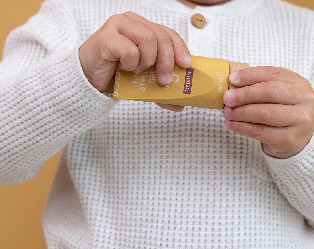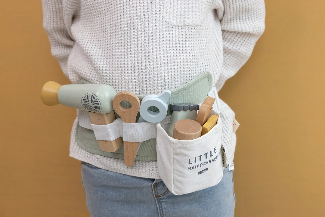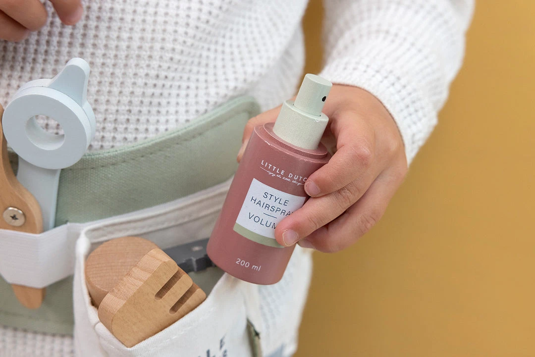 Hair Dresser Play Set by Little Dutch. Become a professional hair stylist! Invite your friends, family, and dolls over to your hair salon. Get into character with the adjustable waist belt and create the most stunning hairstyles. This wooden set of essentials for hairdressing, includes toy scissors, a blow dryer, a straightener, clippers, a comb, shampoo, hair spray and styling gel. Your little one will have so much fun playing this part.