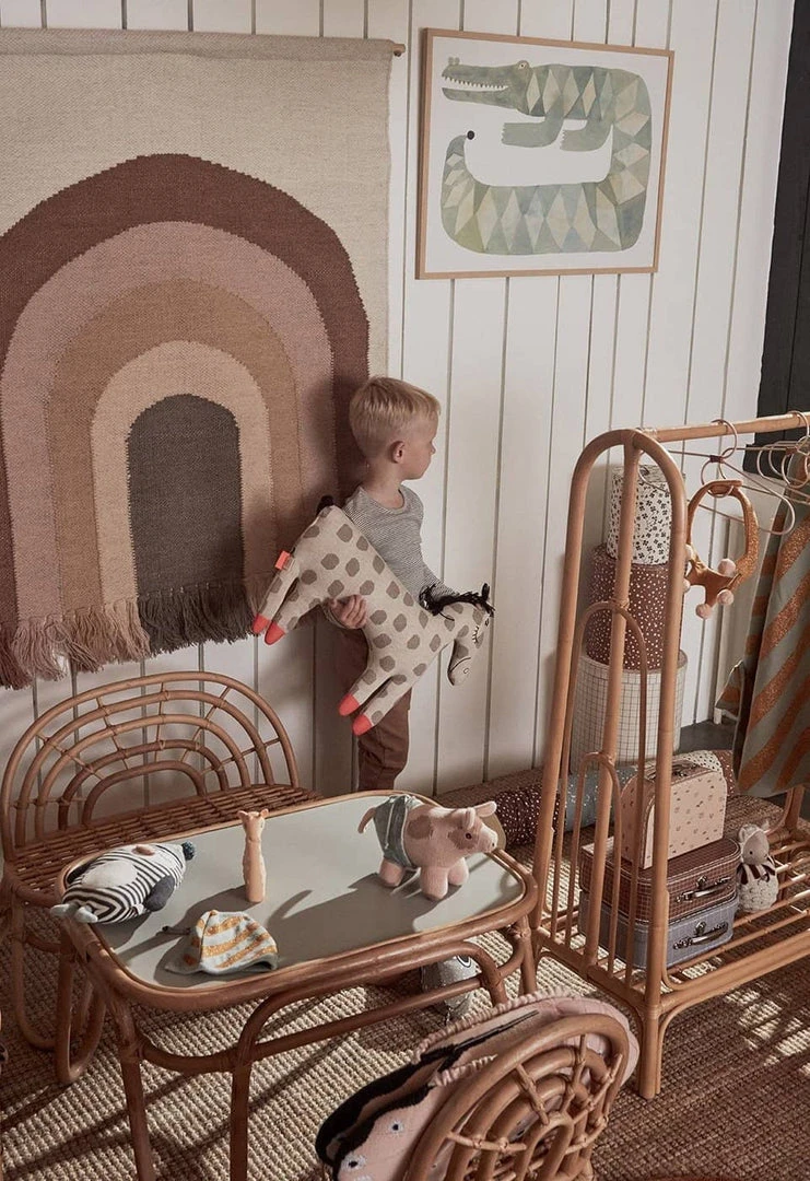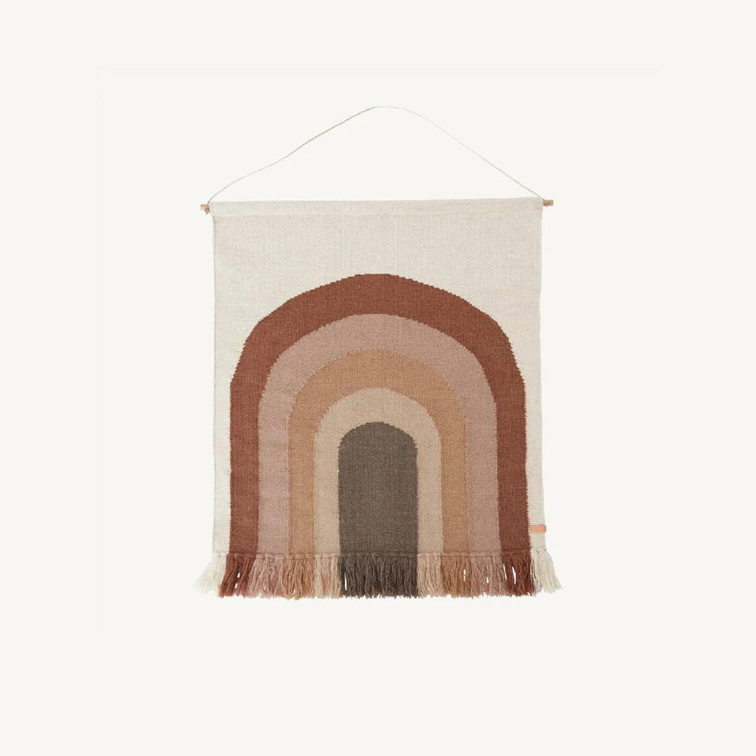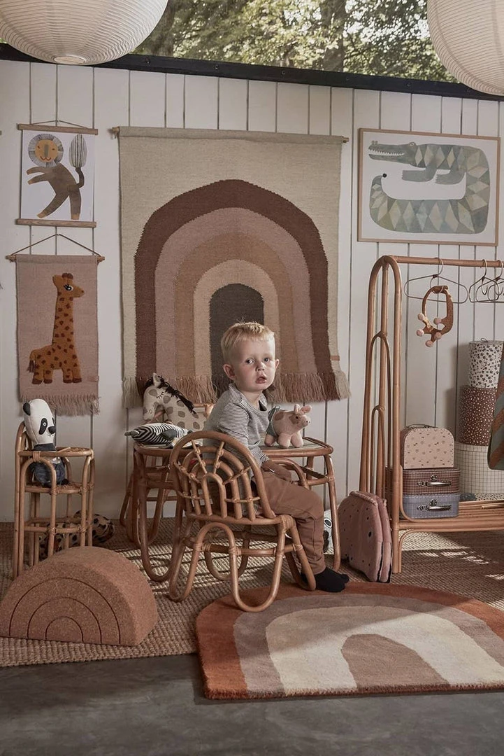 ‘Follow The Rainbow’ Wall Rug in Choko by OIOI. This beautiful rainbow design wall rug is a real statement piece and a stunning addition to any kids room or living room. The soft muted colours blend beautifully in the home, giving it a lovely warm feeling, perfect for rainbow themed rooms and mixing other rainbow accessories! Match with our OYOY Rainbow Rug in Choko to create the perfect Rainbow themed room.